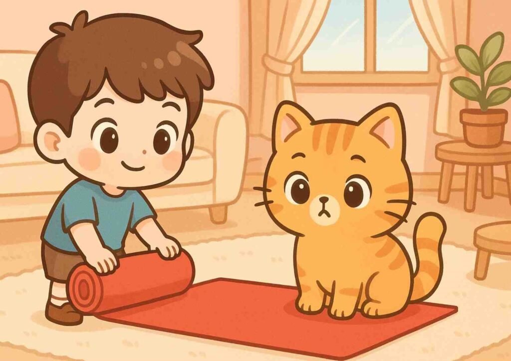 Dan got the cat. The cat is off the mat.