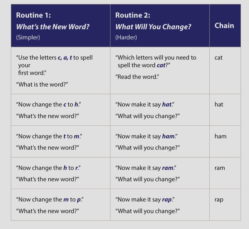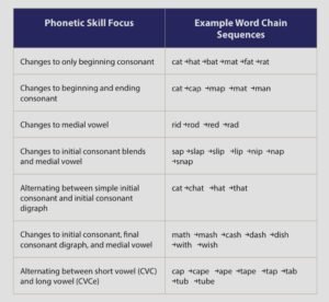 Word chaining is an exercise that allows students to practice phonics and phonemic awareness at the same time by making or breaking words.